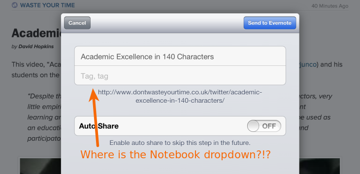In the old Zite, you could share an article and drop it into a notebook at the same time using Evernote’s traditional screen: