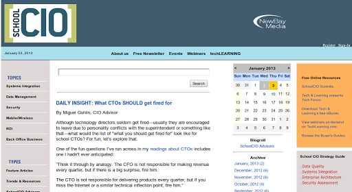 Thanks to SchoolCIO’s Ellen Ullman (editor) for sharing this edited (thank goodness) version of my wannabe tome, What CTOs SHOULD Get Fired For. You can read the edited version online at the SchoolCIO site.