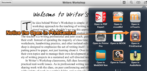 2) Tap on the “Open in…” button and select “Open in PrintCentral:”