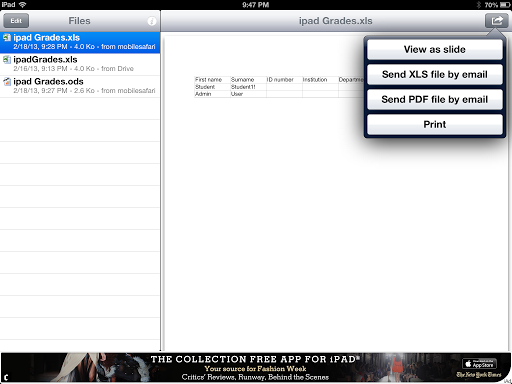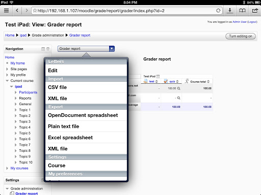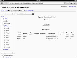 So: For teachers using the iPad to manage a Moodle course, how can we download a gradebook into Excel, open it on the iPad, and send it to someone as an attachment or compress and store it? (These are the normal operations.)