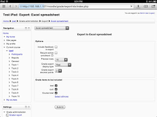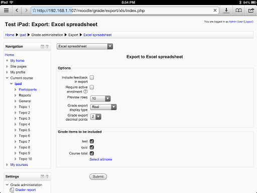In case you’ve forgotten, here are the reports available in a Moodle course…I’m viewing them on an iPad and I want to get the Excel spreadsheet so I can view this in a spreadsheet program of some sort.