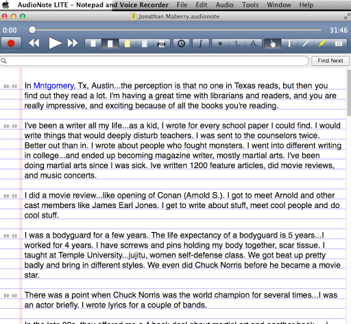 Enter AudioNotes, an iPad app that records audio and syncs your typed text (notes) with each other. Want to jump to a spot in the audio recording? Tap on a word that jogs your memory. Absolutely wonderful and works on your iPad with or without an Internet connection.