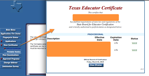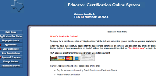 Effective today, March 1, 2013, the Educator Certification Online System has changed. This is the website that houses all certification information, including certificate renewals. When you access the educator certification login through the TEA website, a new web page will appear with step by step directions on how to update your personal information and transfer (migrate) your certification information from the previous system.