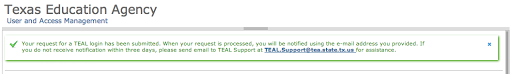 Your request for a user account to access TEA online applications has been processed. You must use the username and password provided below to log on to TEAL. You will also receive additional email message(s) when access is provided to the specific TEA application(s) you request.