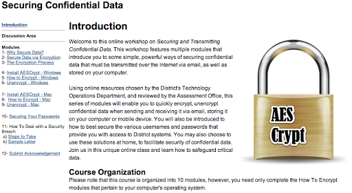 Using online resources chosen by the District’s Technology Operations Department, and reviewed by the Assessment Office, this series of modules will enable you to quickly encrypt, unencrypt confidential data when sending and receiving it via email, storing it on your computer or mobile device. You will also be introduced to how to best secure the various usernames and passwords that provide you with access to District systems. You may also choose to use these solutions at home, to facilitate security of confidential data. Join us in this unique online class and learn how to safeguard critical data.