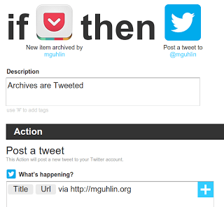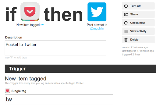3. Setup an IFTTT.com recipe to send your tagged posts in Pocket to whatever service you want, adding other neat stuff along the way (for example, I’ve added a link to my blog at the end).