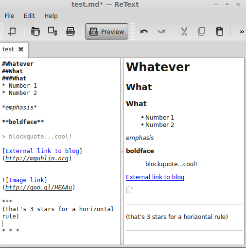 Here’s what it looks like in ReText, a markdown/text editor for UbuntuLinux, although these are certainly available for Windows, Mac as well!