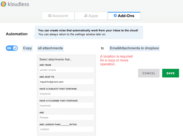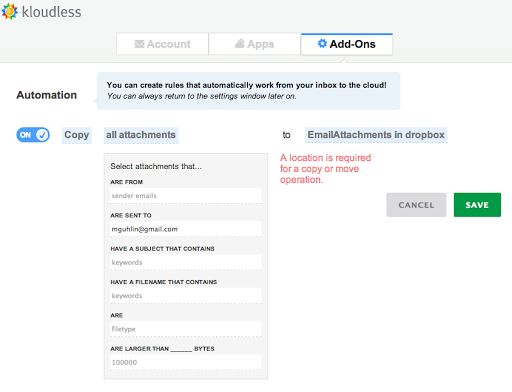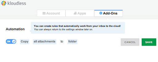 - Kloudless offers a simple, secure way to move attachments between your email inbox and other cloud storage services.