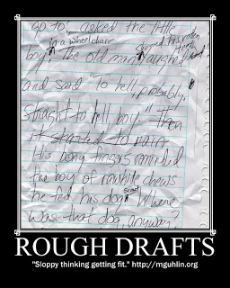 I like to think of “rough draft” writing–writing that is never finished–as a way of “Sloppy thinking getting fit.” For fun, I used BigHugeLabs.com to make this poster (try it, it’s easy!) from something Stephen King allegedly wrote when he was 10 years old…it reads like Stephen King!