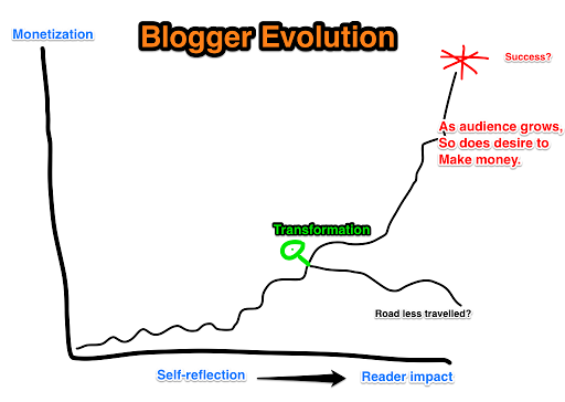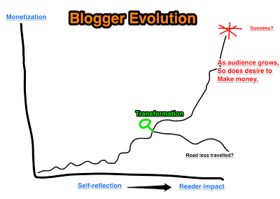 I do agree that blogging changes us. Those of us who have been blogging for a while can attest that blogging is a very impactful experience.I'm not sure about your graph, though. For many, is it a desire to make money or a desire to spread ideas and influence?