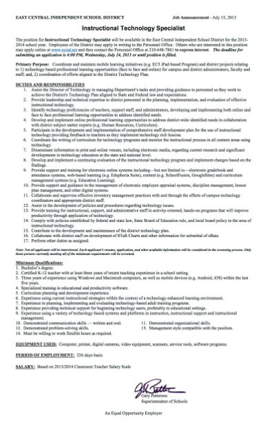 The position for Instructional Technology Specialist will be available in the East Central Independent School District for the 2013- 2014 school year. Employees of the District may apply in writing to the Personnel Office. Others who are interested in this position may apply online at http://www.ecisd.net and then contact the Personnel Office at 210-648-7861 to express interest.
