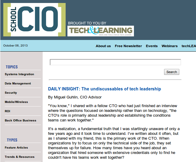1. Hi Miguel,Great article – one that's been needed?Other than asking why our district is keeping its creaky old tech director, I think we should be asking the role of technology in creating change. Should change be driven by new abilities that technology gives educators – or should we following the lead of the curriculum and instruction department. (Hopefully it is a combined effort.) What happens if CI is stuck someplace in the dark ages? Do we follow, do we lead, or do we just do our own thing?Doug