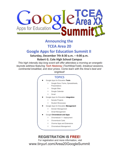 2) We will once again host an Area 20 Google Apps for Education Summit. If you use Google Apps in your classroom or school, this the day for you! We will have a great keynote speaker (Todd “Tech Ninja Todd” Nesloney). Reps from CDW-G will be there to showcase the latest Google Chromebooks and Kevin Hodges from Google will be presenting sessions. There will also be sessions from area teachers and students. The event is FREE and open to all educators! Find out more and register at https://sites.google.com/a/fsh.echalk.com/area20gafesummit