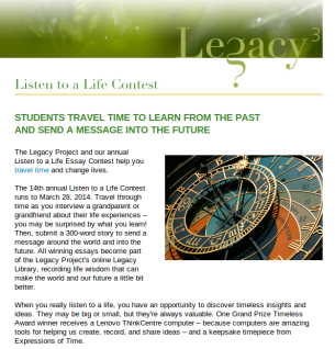 Students and teachers can find out more about the Listen to a Life Essay Contest, including complete contest rules, at www.legacyproject.org.