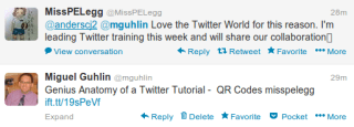 After tweeting about QR Codes on postcards (thx @tombrush1982) to my team members, a link shared via #satchat, I found myself in conversation with MissPELegg (The HeathLand School), who may be a Physical Education teacher in the United Kingdom. Wow! Isn’t that exciting?