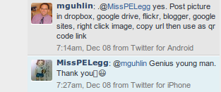 Her question, as I finally came to understand it, was, How do you link to images using QR Codes? In response to that question, I shared a couple of tweets yesterday as I went about taking care of some personal priorities, that regrettably, kept me from attending the Google20 Conference in San Antonio, Texas.
