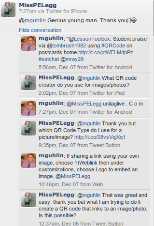 After tweeting about QR Codes on postcards (thx @tombrush1982) to my team members, a link shared via #satchat, I found myself in conversation with MissPELegg (The HeathLand School), who may be a Physical Education teacher in the United Kingdom. Wow! Isn’t that exciting?