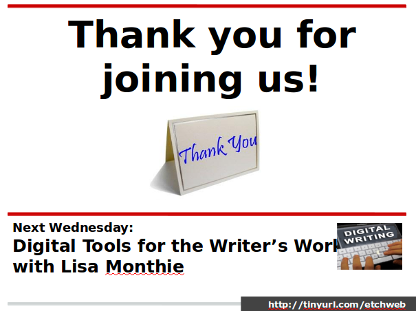 Welcome to the Weekly Webinar Series on Digitizing the Writing Workshop. The co-hosts for Weekly Webinar Series on Digitizing the Writing Workshop include Diana Benner (Del Valle ISD, Tx) and Miguel Guhlin (East Central ISD, Tx). Find out more–such as the schedule for webinars, recordings and future guests–about the series online at http://tinyurl.com/etchweb or Twitter Hashtag: #etchweb