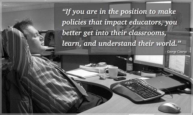 If we can set aside pointless debates about who’s selling Chromebooks over machines with different capabilities/functions, whether one technology is better than another (although we must clarify that tech and how it will be used), we can focus on the important stuff, such as George Couros’ quote that Stephen Ransom has so ably captured in this image: