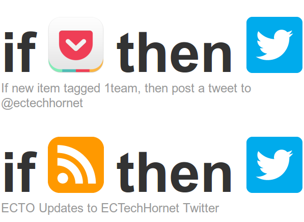 - Start Using a Work-specific IFTTT.com. I actually had created an IFTTT.com account for my work content, but had gotten comfortable creating everything in my personal IFTTT.com. I decided to clean out my recipes in my personal IFTTT account, creating new recipes in my work IFTTT.com account. I ended up with about 14 recipes that are keyed on several tags that appear in Pocket. Both my work and personal IFTTT accounts tie into my personal Pocket account, but because of the tags I use, I can tweet to different twitter accounts. Check sample recipes at bottom of this blog post.
