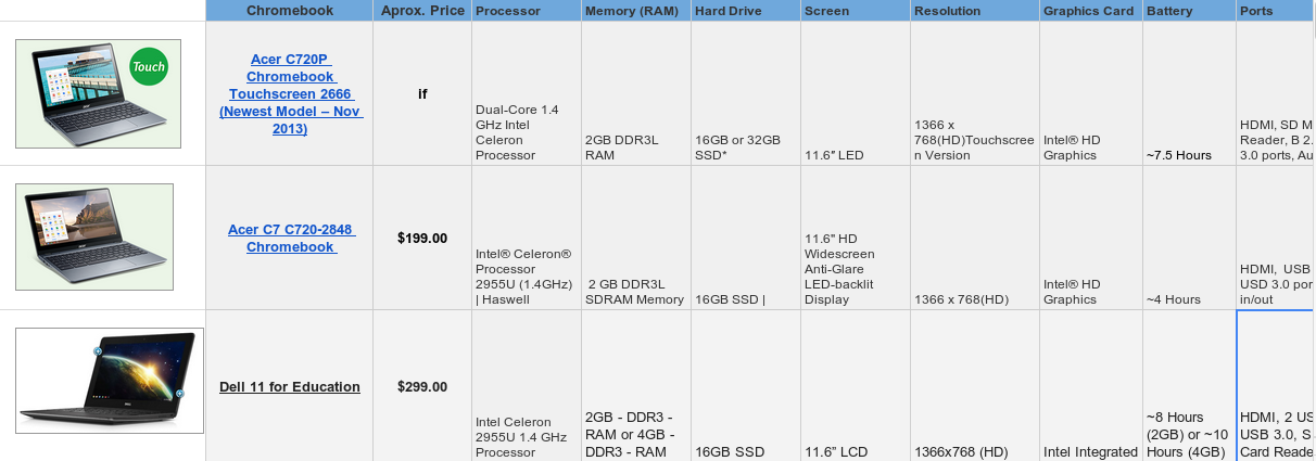 When I spoke to my teammates, one of them, Marguerite Lowak (@mlowak) immediately started compiling information available and came up with the following Chromebook Comparison chart. What a thrill to see a great Chromebook Comparison like this…I immediately wanted to share the chart.