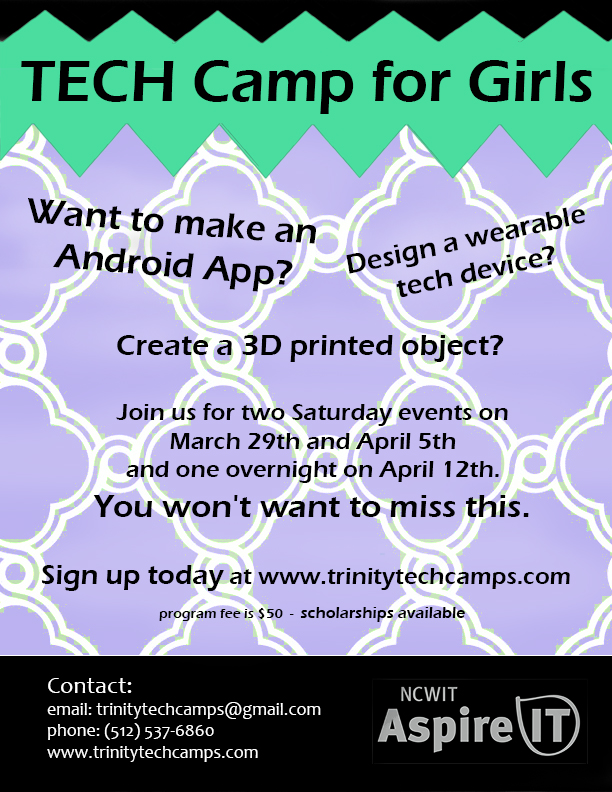 The National Center for Women & Information Technology funded a grant to run a middle school program to get girls interested in computing. The resulting program is called TECH Camps, which stands for Trinity Encouraging Computing for Her. Girls in grades 6-8 students are the intended audience; check the flyer below for more details. Cost is $50 but scholarships are available.