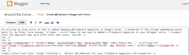 In writing my blog entry on how to embed an @Flipboard magazine in Google Sites, I wondered if the iFrame embedding would work for my blog. Sure enough, it does…scroll down to see how to embed a Flipboard magazine in your Blogger entry. I suspect that the approach may work with other web sites, too!
