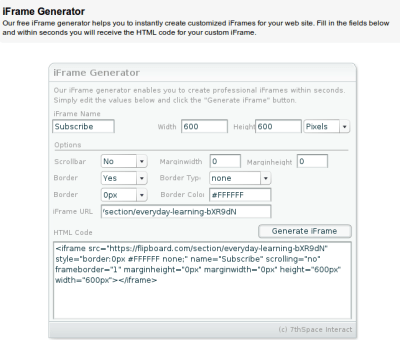 Not knowing how to create my own iFrame, I did a quick google search and it took me to the Online iFrame generator web site, which will take your URL from step 1 and then create the code.