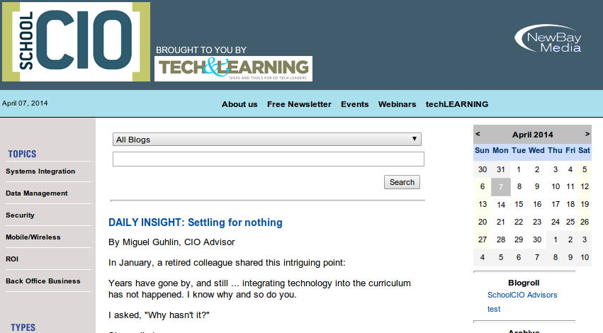 Thanks to the SchoolCIO for featuring another one of my blog entries, Settling for Nothing, on the SchoolCIO web site.