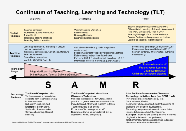 You can see the mention of SAMR, which I’m not sure fits, but I would put it in. It dominates the bottom half of the diagram with little explanation. I suspect that this acronym could be fleshed out even more with more words, but I would like to see a representative image for each one of these letters (SAMR). For example, substitution might be the logo of an integrated learning system. Augmentation might be a word processor, modification a web site, a video or audio, and redefinition, well, an image that represents digital collaboration.