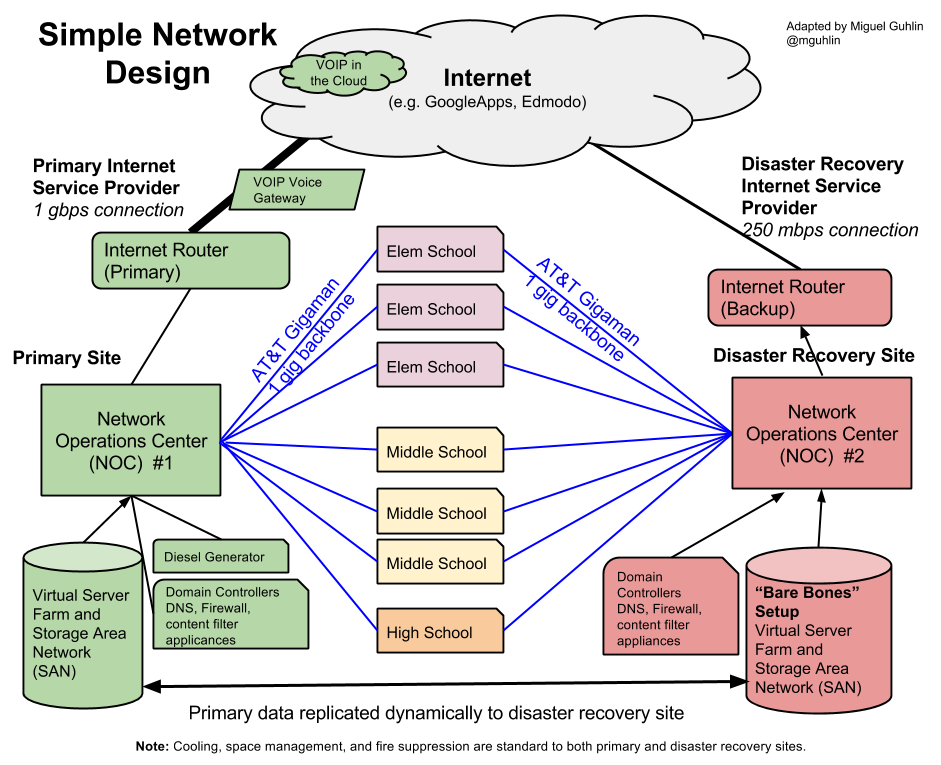 - Network Connections from campus to NOC – Imagine if your primary network operations center were to be knocked out. Even if you had a data backup of all the equipment at the primary NOC, you would still be unable to get everything back up and running. There would be no way for internet to connect to your district, and no way for campuses to connect to your data and the web.