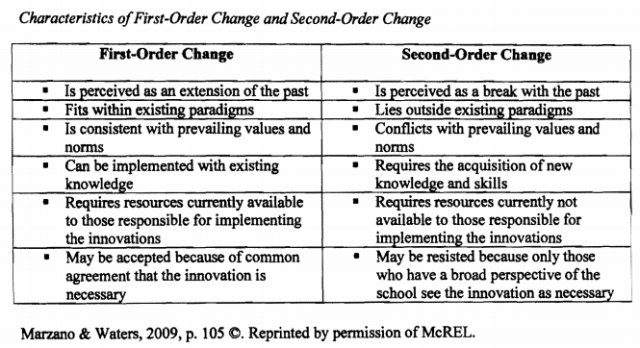 - I very much enjoyed Dr. Biggs’ literature review, and the points made about first-order and second-order change. As a Technology Director, first-order changes (technical in nature) appear the easiest place to show growth quickly. Second-order changes (changing teacher attitudes about blending technology into instruction) are the hard part.