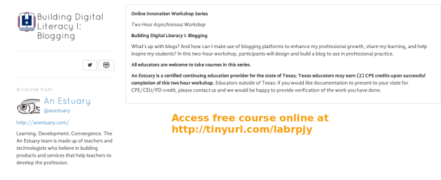 Wanted to share a great opportunity for Texas educators to earn CPE credits. We’ve just launched the first in what will be a series of online courses and workshops for Texas educators on our new http://sanderling.io professional development platform. By successfully completing “Building Digital Literacy I: Blogging”, educators will earn 2 Texas CPE credits. This workshop is completely free for participants. Sign up, sign in, and earn credit — anywhere, anytime, from any device. Go to https://sanderling.io/courses/building-digital-literacy and sign up for free today. And please share this opportunity with other Texas educators! We’re looking forward to learning with all of you on Sanderling.