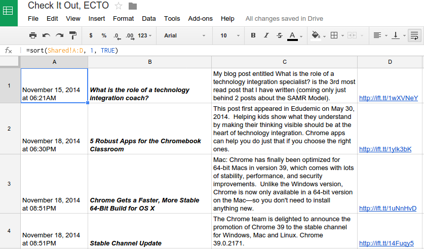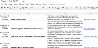 2) My IFTTT.com recipe takes anything tagged with “2ecto” and saves it to a spreadsheet in my work GoogleApps/Drive account.