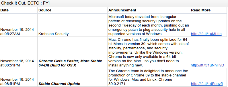 As I was reading about Google updating the Chrome browser on Mac to 64-bit, reading about other stuff that would be great for my team at work to have access to, I wondered how I could get the information to them. There are lots of ways to “tag” work or save it for others and I’ve played around with those (e.g. RSS).
