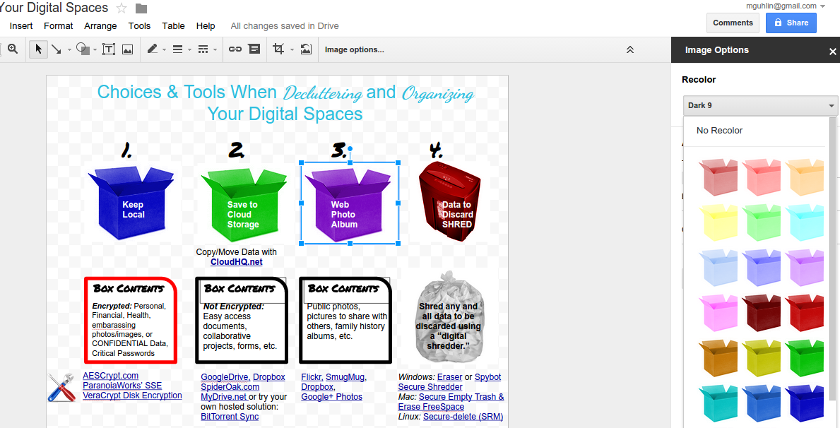 I had no idea you can re-color an image in GoogleDraw! What a neat trick to be aware about…pretty cool! You can see I’ve selected cardboard box (which started out brown, by the way) and can color it. This works with images you insert from anywhere on the web! What a neat way to make an image one’s own!!