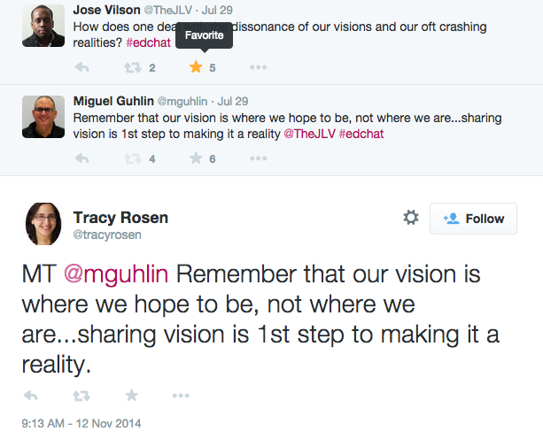 Earlier this year, Tracy Rosen sent out a modified tweet that brought me face to face with one of my Twitterchat contributions…I promptly promised myself that I’d come back to this blog entry, but realize now it’s been months! The conversation came back to mind after an exchange featured at the end of this blog entry.