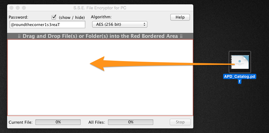 Essentially, you type in your password then drag the file you want to encrypt into the SSE window (as indicated by instructions, Drag and Drop File(s) or Folder(s) into the Red Bordered Area).