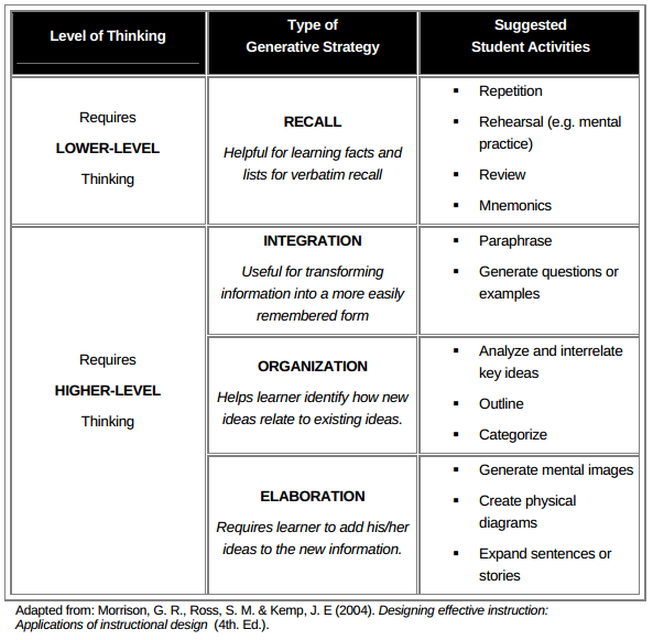 - An easy way to ensure that your students engage in critical thinking activities is to include one or more of the following generative learning strategies in each lesson: recall, integration, organization, and elaboration