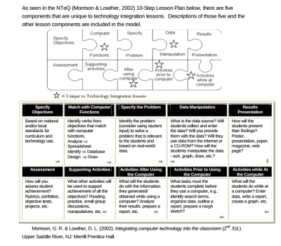 - The iNtegrating Technology for inQuiry (NTeQ, pronounced “in-tech”) approach to technology integration recognizes this underlying philosophy of computer use within K-12 schools (Morrison & Lowther, 2002). It provides a specific role for the important individuals and components involved in K-12 classroom learning — including students, teachers, computers, and lessons.