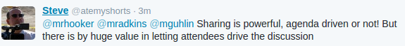 My first experience with ad-hoc organizational meetings like this involved a conversation Steve Young (Judson ISD CTO) had with me during a TEC-SIG meeting a few years ago. As I recall, the main benefits that attracted us to this format included slipping away from top-down structured conversations and vendor presentations.