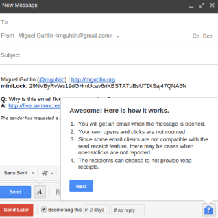 - MxHero – This was my favorite for a long time, but the time came to pay for it, and I wasn’t willing to do that. “features include open and URL click tracking, attachment tracking, self-destructing emails, email read receipts and the ability to schedule an email for later“