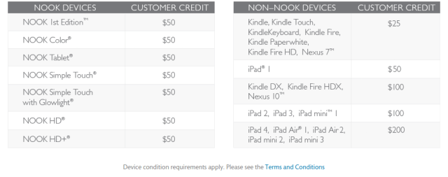 My Nook First Edition will get me $50, as will my SimpleTouch (although, it’s not working…sigh). They also accept non-Nook devices, like Kindle, iPads and iPad Minis. I probably won’t be trading in my iPad 3rd gen (64gig) WiFi since it still works great, and I’d only get $100 for it.