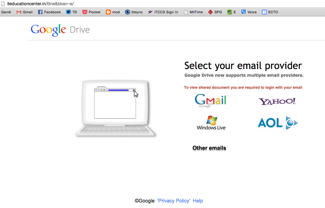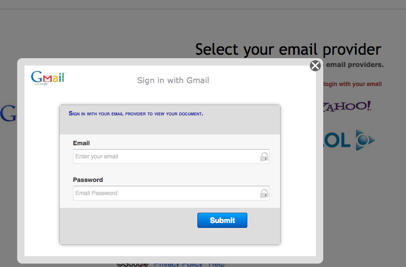 As you can see from the image above, I was being asked to select my email provider. To avoid cookie capture, I went ahead and clicked on AOL.com (later, I also clicked on the other options, too) to see this poorly masked attempt at getting my cloud email username and password: