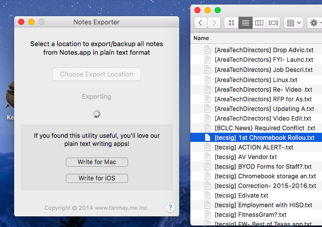 The Write app folks have come up with Notes’ Exporter, a utility that runs on your Mac OS X computer (I’m running El Capitan) and it’s now slogging (successfully!) it’s way through the export.