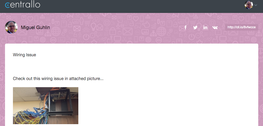 “The wiring in this cabinet,” pointed out a colleague, “is a mess. And, look at those cardboard boxes!” I picked up my iPhone, snapped a picture into Centrallo, shared the Room # and campus, then passed the link on.