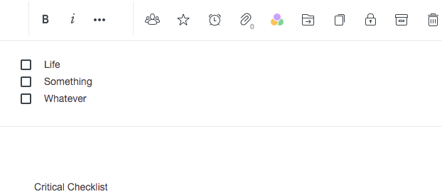 With Centrallo, you can put all your To-Do items in a list, inserting checkboxes in front of each. Funny thing, though, it puts the checkboxes at the top of the document, above the title (e.g. “Critical Checklist”). As you finish them throughout the day, simply tap on the checkbox to place a checkmark. What a great visual way of working through your To-Do list or a long checklist. I have to admit that I also like Google Keep for short-term to-do lists and checkboxes.