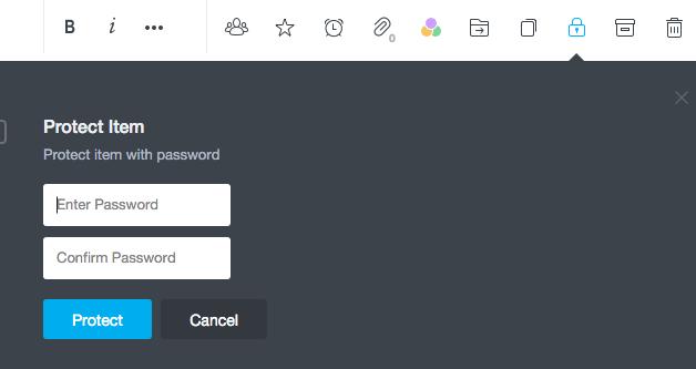 With Centrallo, you are able to “protect” sensitive notes that may contain confidential information. I always recommend encrypting sensitive data before putting it in the cloud but you can also add another layer of protection by choosing “Protect” on a Centrallo note. This allows you to add a password and that note can’t be opened without it.