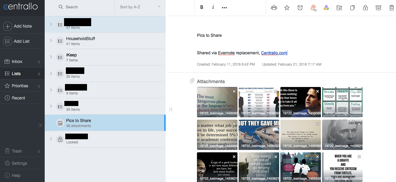 Centrallo uses–here’s a video overview–two organizational principles, including List and Note. You can create a list that contains various notes, group notes according to lists. The interface is quite simple and easy to work with and fast on mobile devices!