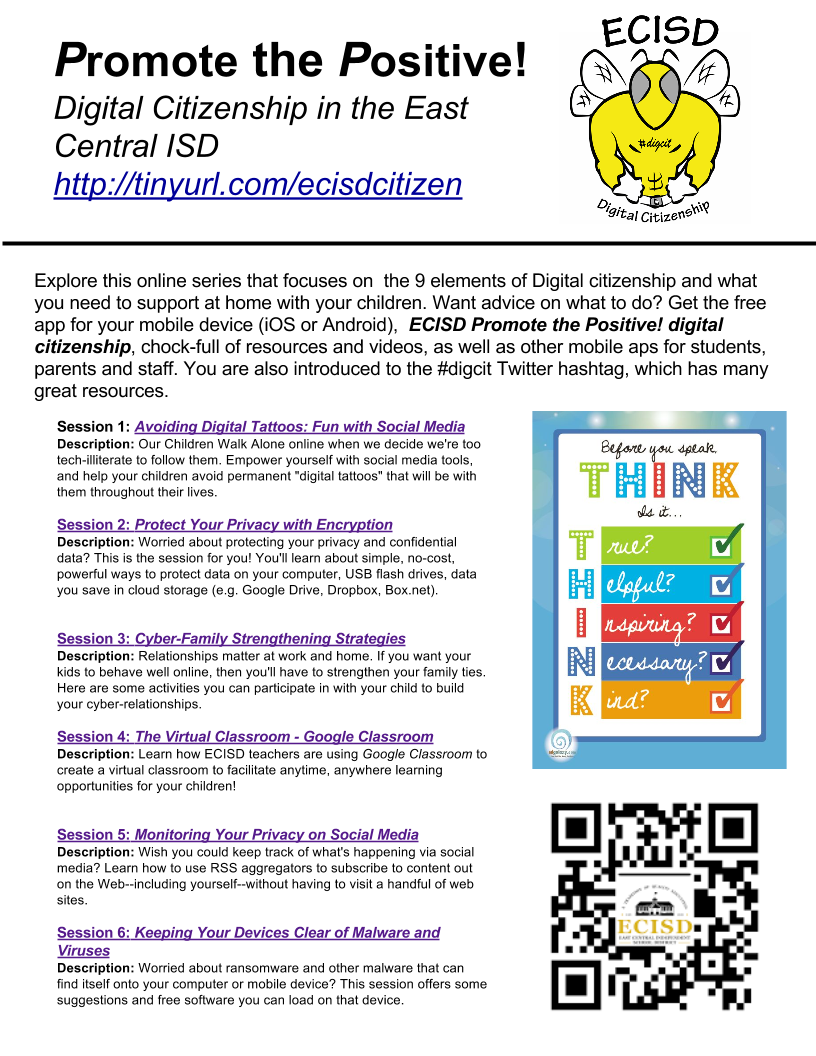 As I shared in this blog entry, East Central ISD will be holding a Heroes for Health event at the East Central High School on Saturday, March 5, 2016. One of the booths, which will be staffed by Mary Ray (@mray29) and Marguerite Lowak (@mlowak), is the Digital Citizenship booth. You can access the resources online: tinyurl.com/ecisdcitizen